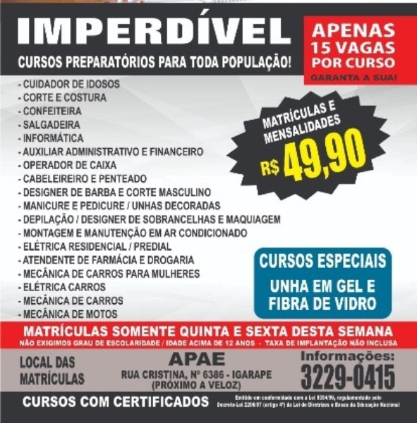 Endereço: APAE – Rua Cristina 6386, próximo a Veloz, bairro Igarapé -INFORMAÇÕES 3229 0415