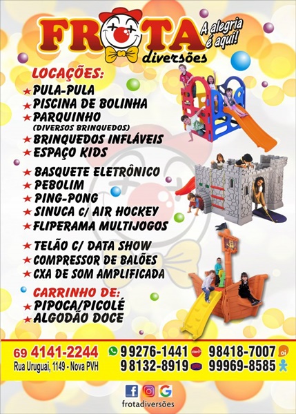 Entre em contato com a equipe Frota Diversões através dos telefones (69) 4141-2244 / 99276-1441 / 98418-7007 / 98132-8919/ 99969-8585