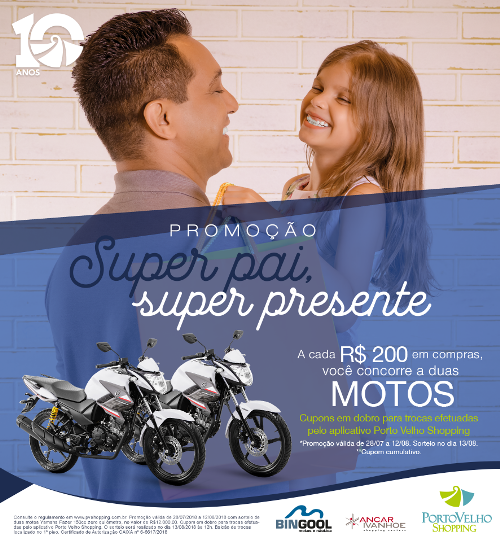 A cada R$ 200,00 em compras no Porto Velho Shopping, você concorre a 2 motos.