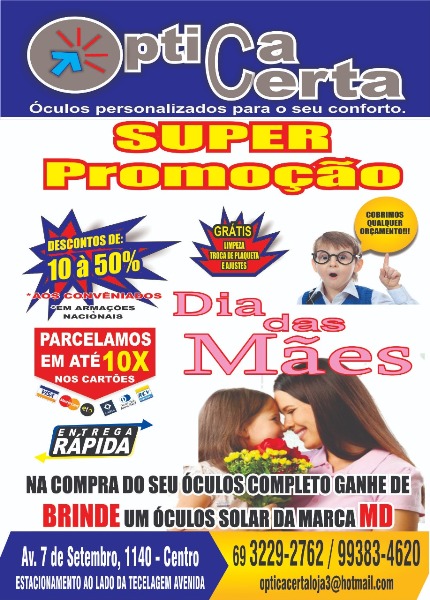 A Óptica Certa realiza neste mês uma super promoção para você comprar o presente da sua Mamãe com preço especial, facilidades para pagamento e você ainda ganha brindes, venha conferir.
