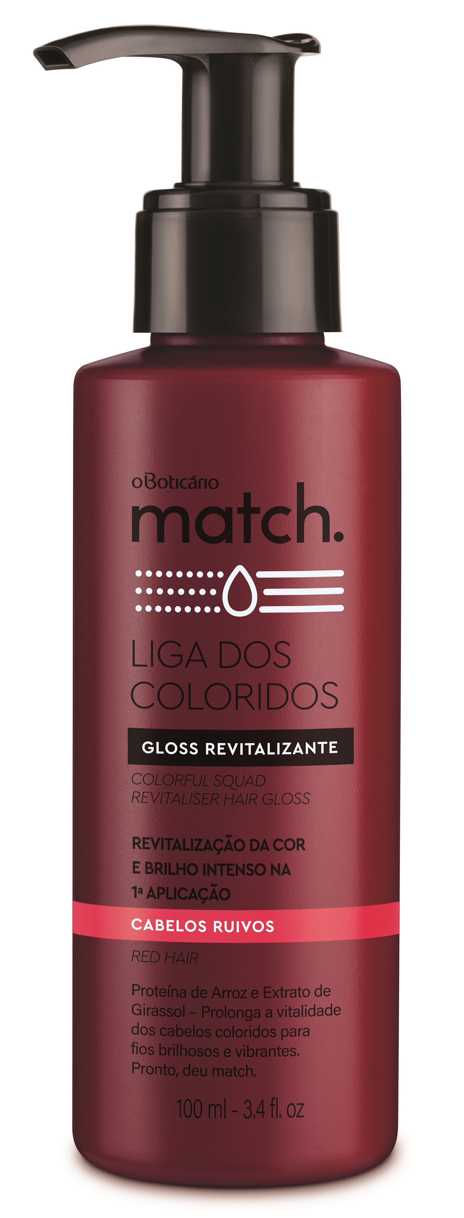 Já para os cabelos ruivos e castanhos, o destaque fica por conta do nosso Match Liga dos Coloridos Gloss Tonalizante, que ajuda na revitalização da cor. O segredinho dele fica por conta da proteína de arroz e extrato de girassol que protegem a fibra capilar contra danos externos, prolongando a durabilidade da cor, para um colorido intenso, brilhoso e cheio de vida.