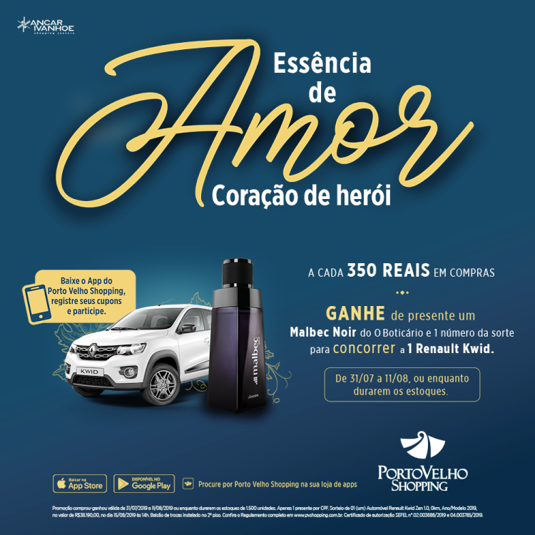 O cliente que comprar a partir de R$350,00 no período de 31/07/2019 a 11/08/2019 poderá trocar suas notas fiscais por 1 perfume Malbec Noir do O Boticário e concorrer a 1 Renault Kwid 0km.