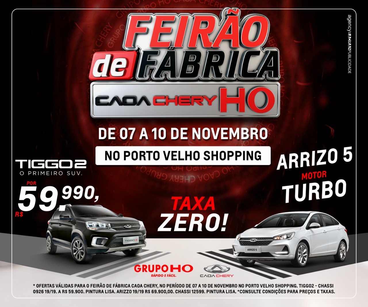 São mais de 500 veículos com uma sensacional gama de seminovos com garantia de um ano para motor e câmbio. Feirão de Fábrica Caoa Chery no Porto Velho Shopping de 7 a 10 de novembro Grupo Ho, rápido e fácil *consulte condições para preços e taxas.