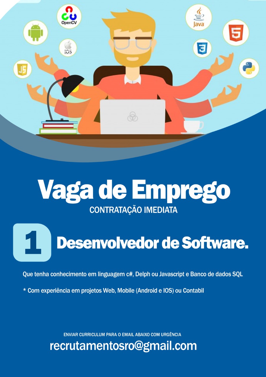 Vaga de emprego disponível para função de Desenvolvedor de Software, com experiência na função e conhecimento em linguagem C#, Delph ou Javascript e Banco de dados CQL com CONTRATAÇÃO IMEDIATA. Leia a descrição na imagem abaixo para a vaga, confira se o seu perfil se encaixa e mande o seu currículo no e-mail: recrutamentosro@gmail.com.