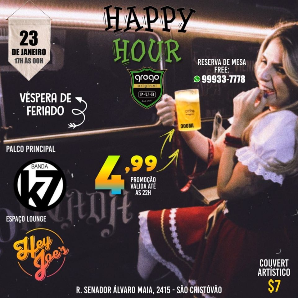 Devido ao feriado de sexta, o Happy Hour será na quinta-feira, 23, véspera de feriado com uma programação super especial preparada para você. Com muito rock, atrações e promoções!