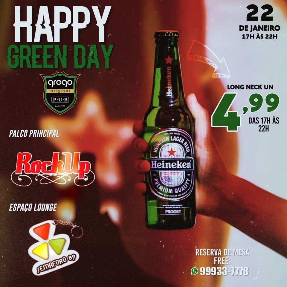 Em uma quarta de cada mês, acontece a novidade do momento é o Happy Green Day do Grego. Dando início nessa quarta-feira, dia 22, das 17:00 às 22:00. Com promoções incríveis, muito rock e couvert artístico por R$ 7.
