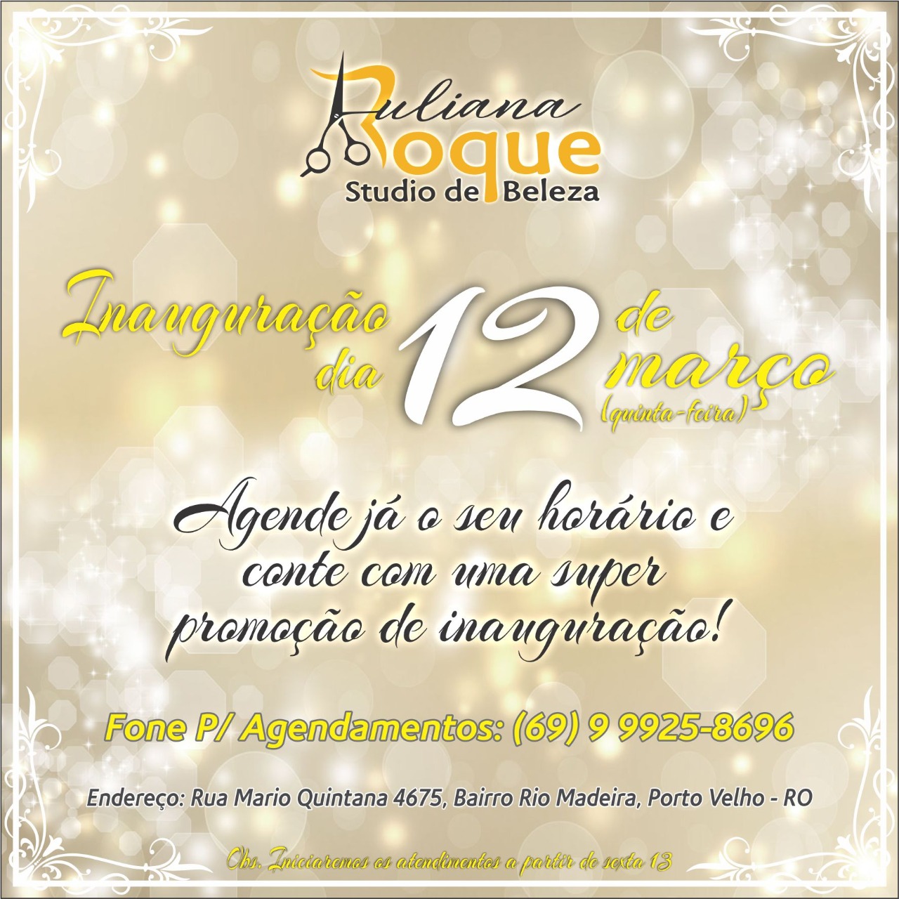 Nessa quinta-feira (12), a partir de 09:00 acontece a Inauguração do Studio de Beleza Juliana Roque, um espaço planejado especialmente para você! Tendo tudo para lhe proporcionar o prazer de se cuidar e a satisfação de ficar cada vez mais bela.