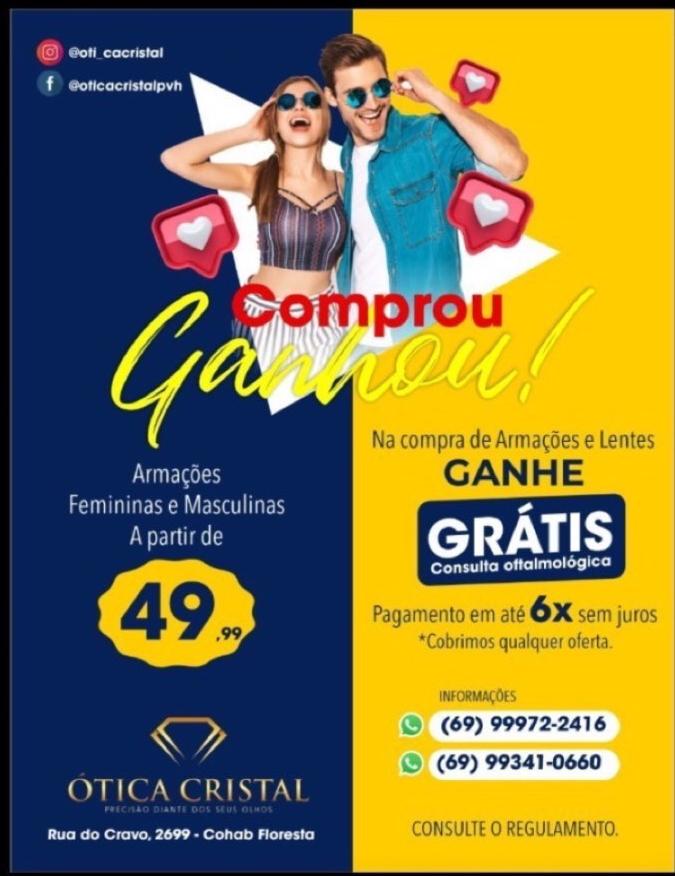 Pensou em armações de óculos, óculos de sol cheios de estilo ou relógios que correspondam aos seus gostos? Com a Ótica Cristal isso é possível e você ainda conta com pagamento facilitado!