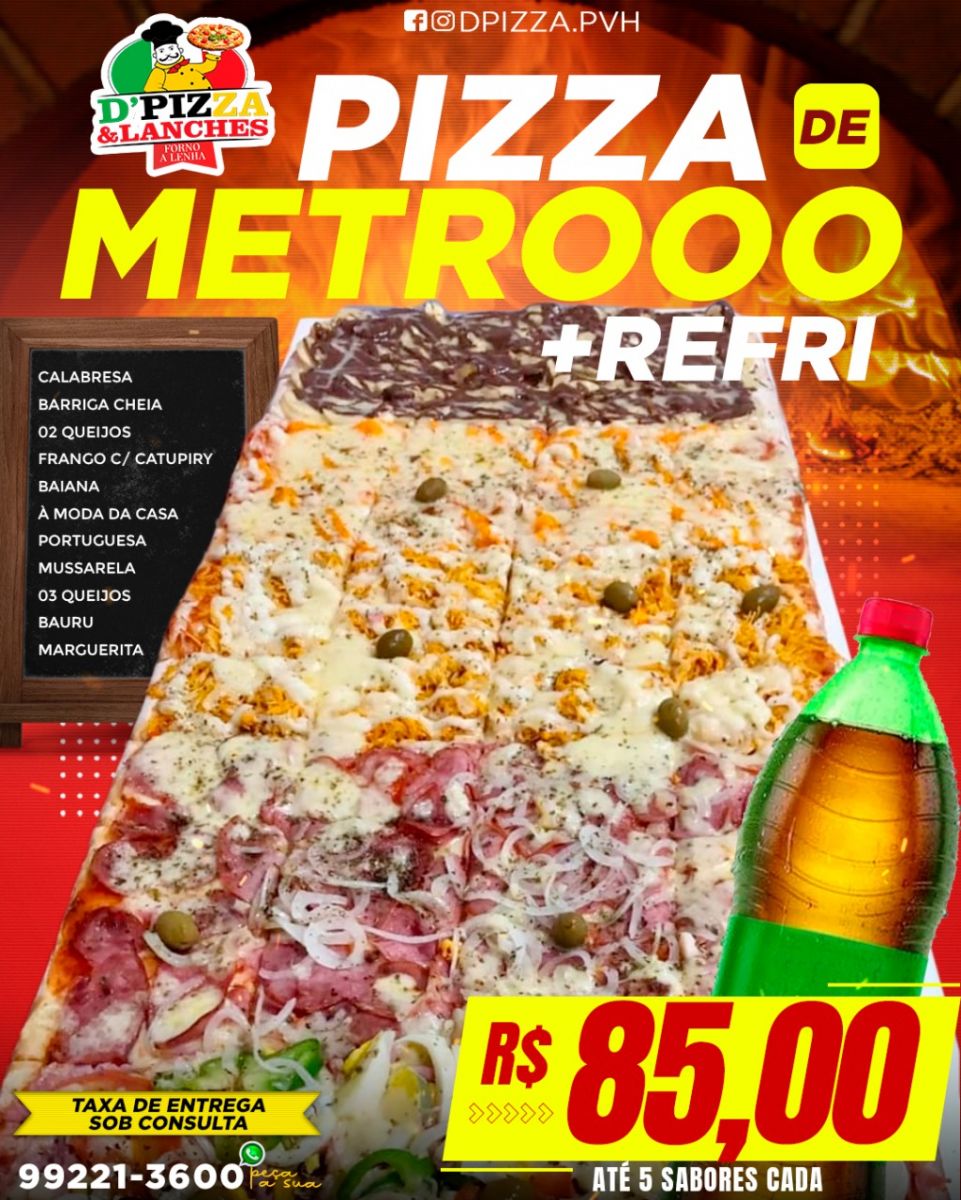 Se você está afim de saborear uma pizza gigante com toda a família, hoje é o dia. A pizza MEIO METRO + REFRI está apenas R$ 85,00 e você pode escolher até cinco sabores dos que estão selecionados. Não vai perder né?