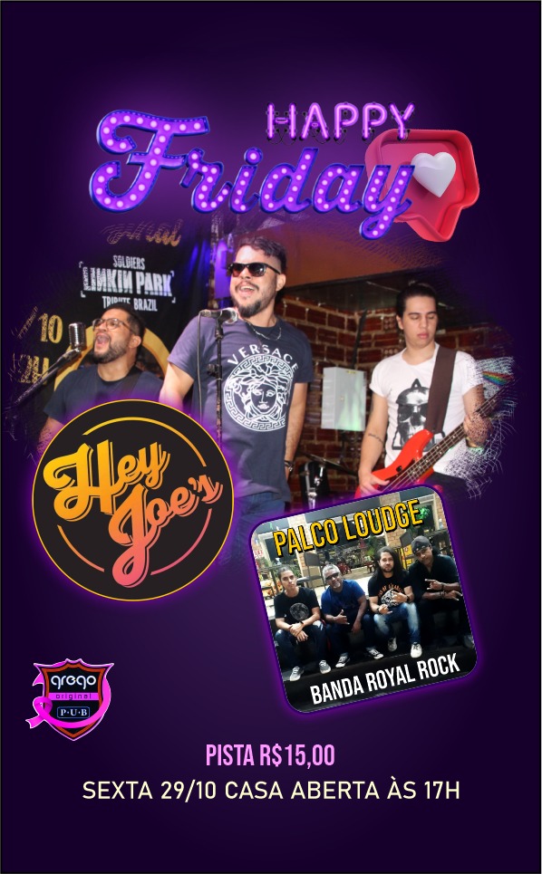 Nesta sexta-feira, das 17h às 00h, tem a Happy Friday, com shows das bandas Hey Joe's e Royal Rock.
