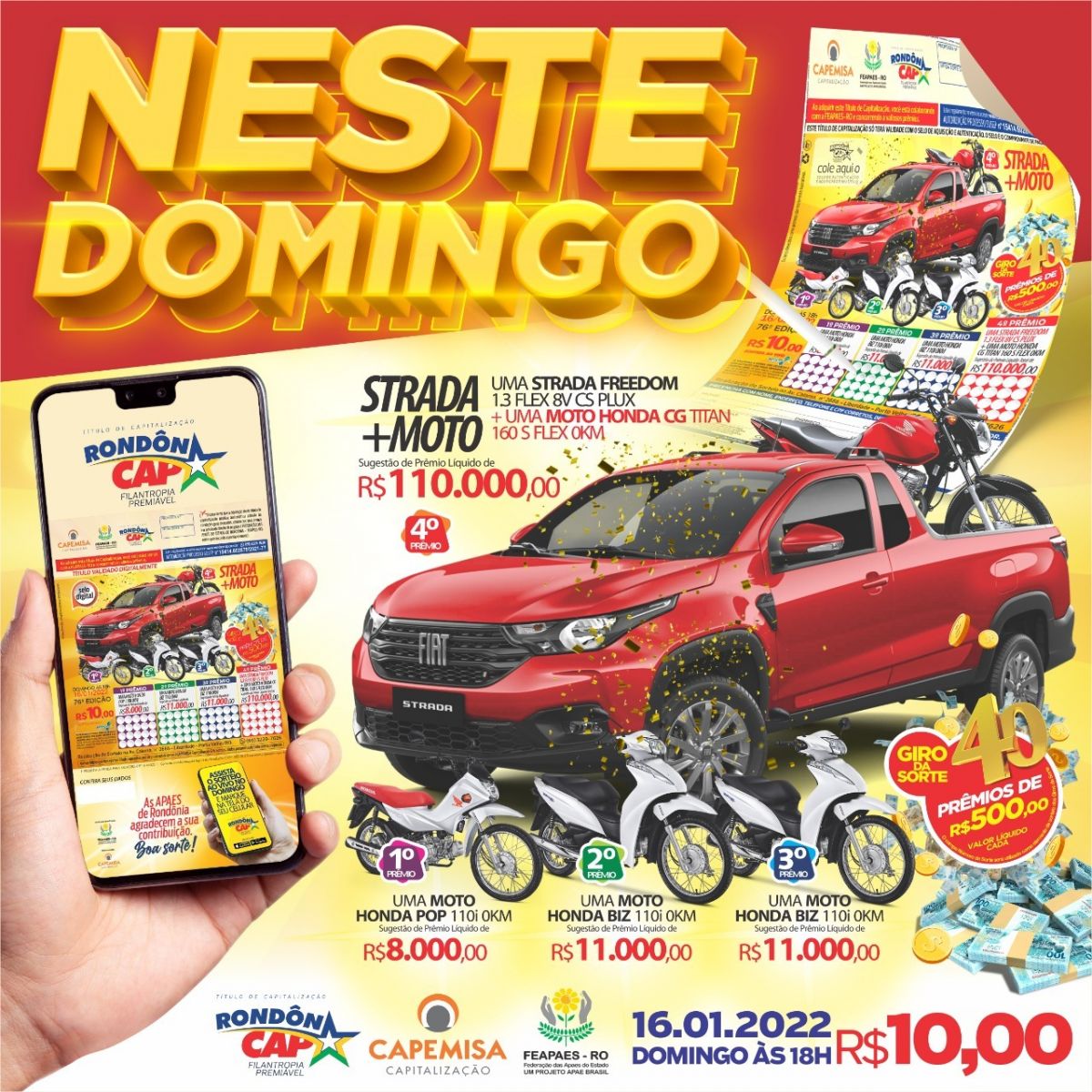 O Rondôncap quer ver você de picape e moto na garagem! No quarto prêmio deste domingo tem uma Fiat Strada carregada com uma Moto Honda Titan na carroceria no valor total de 110.000 reais, e o título é baratinho só 10 reais. 10 reais para ajudar as Apaes e participar. E ainda tem mais 2 honda Biz, uma Honda Pop e 40 giros de 500 reais!