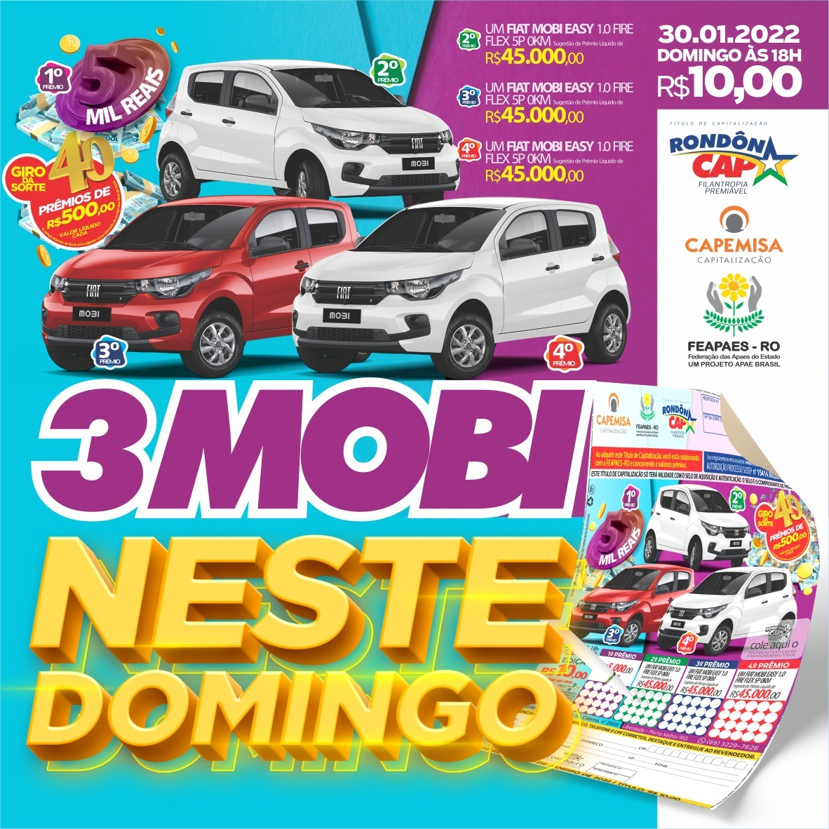No Rondôncap você concorre a carro zero km com preço real! Neste domingo (30) tem 3 carros e o título só 10 reais, no quarto prêmio tem um Fiat Mobi no valor de 45.000 reais, no terceiro prêmio tem outro Fiat Mobi também no valor de 45.000 reais, e no segundo prêmio tem mais um Fiat Mobi no valor de 45.000 reais.