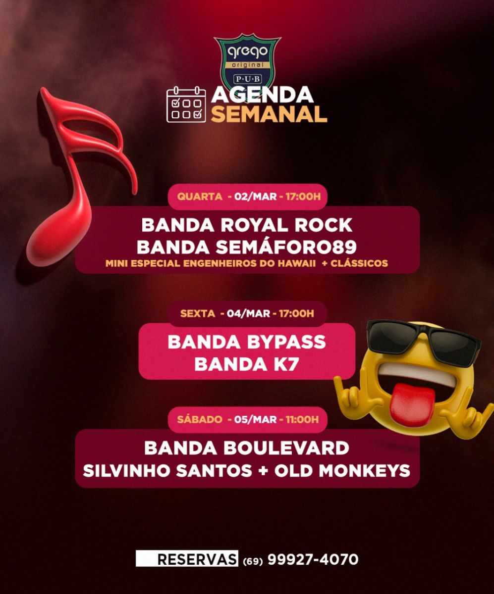 Considerado uns dos maiores Pub da região, com seis ambientes e dois palcos, o Grego Original fica na Av. Álvaro Maia, 2415, bairro São Cristóvão, na região central de Pvh.