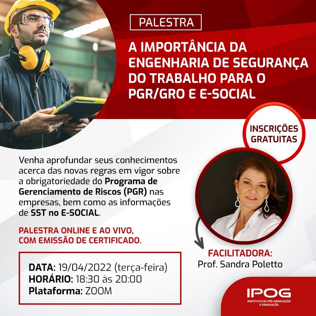 Qual a importância e participação do Engenheiro de Segurança do Trabalho frente as novas regras que entraram em vigor em janeiro 2022, com a obrigatoriedade do PGR Programa de Gerenciamento de Riscos nas empresas bem como as informações de SST no E-SOCIAL? Venha participar desta Palestra em que estas e outras questões serão tratadas. Mais do que nunca a demanda de Engenheiros de Segurança do Trabalho está em alta no mercado, que precisa de profissionais preparados, para atender estas novas regras obrigatórias às empresas.