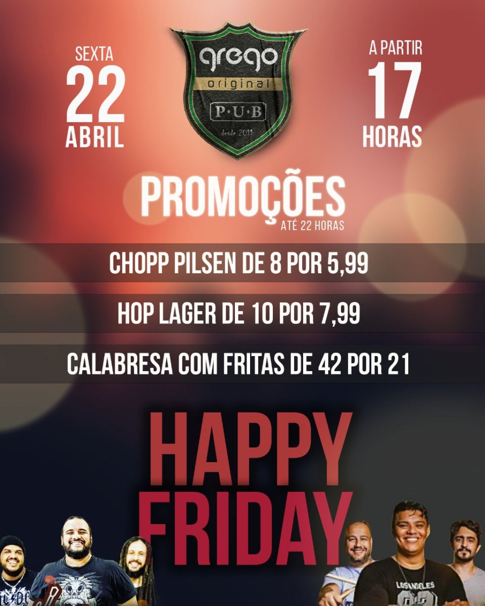 "Nesta sexta-feira vai rolar promoções de chopp e petiscos e muito 'rock and roll' no nosso Grego Original", enfatizou o empresário Sinezio Tapajós, proprietário do tradicional Pub porto-velhense, que hoje, a partir das 17h, tem o evento musical "Happy Friday".