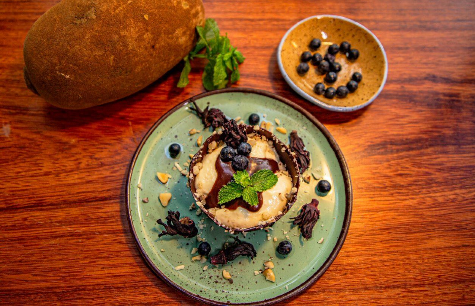 - Cúpula de chocolate invertida com mousse de cupuaçu e Ganache de chocolate.