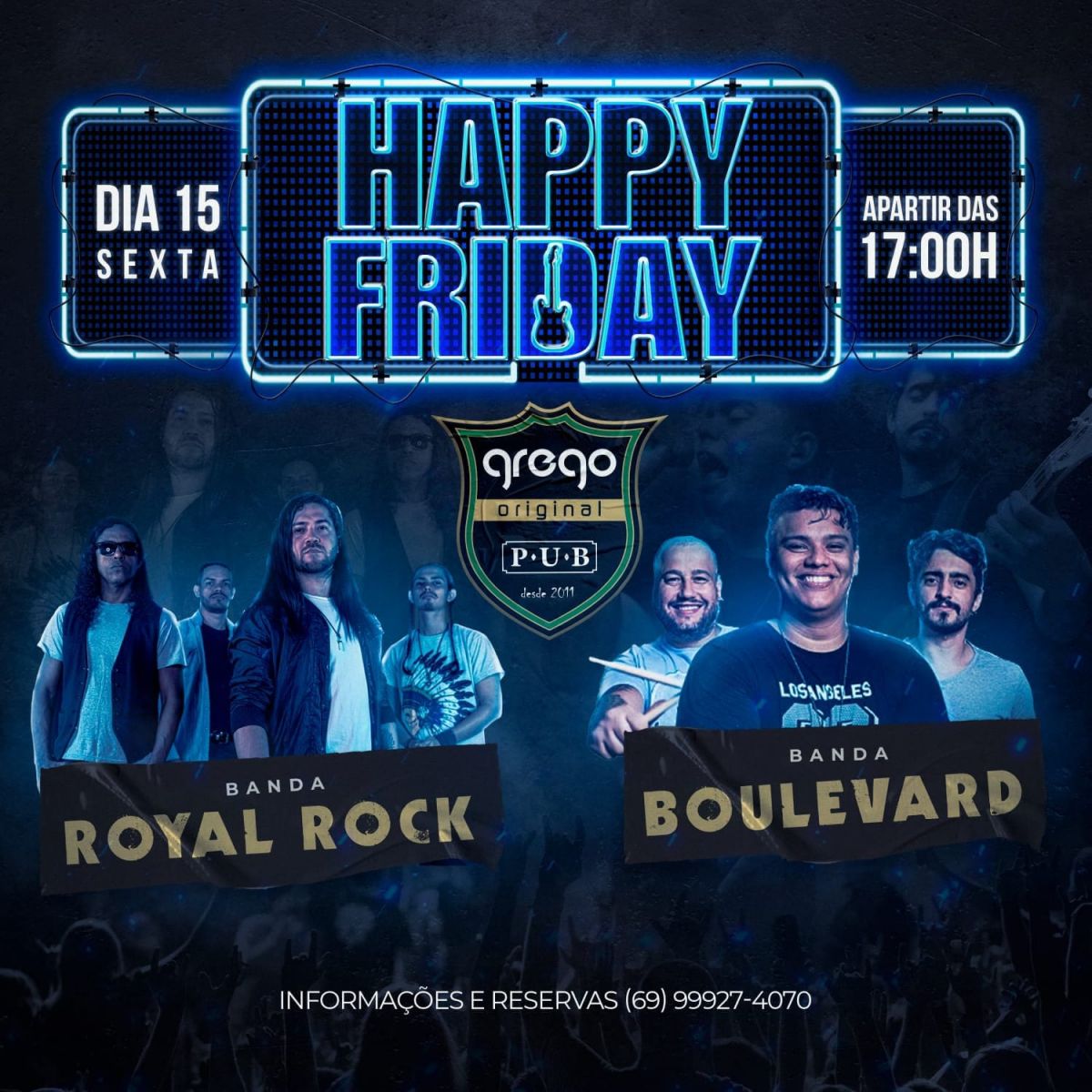 Nesta sexta-feira, dia 15, a partir das 17h, tem o evento músical Happy Friday com promoções de chopp e petisco, mais apresentação das bandas Royal na sequência, Boulevard.