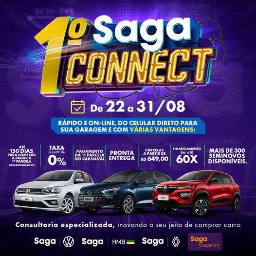 Dos dias 23 a 31 de Agosto acontece o 1º Saga Connect, evento online que une todas as lojas do Grupo Saga de Porto Velho, veículos novos e seminovos em um mega saldão online, descontos exclusivos, taxas a partir de ZERO, o maior estoque de seminovos do estado, e você começa a pagar só depois do Carnaval de 2023