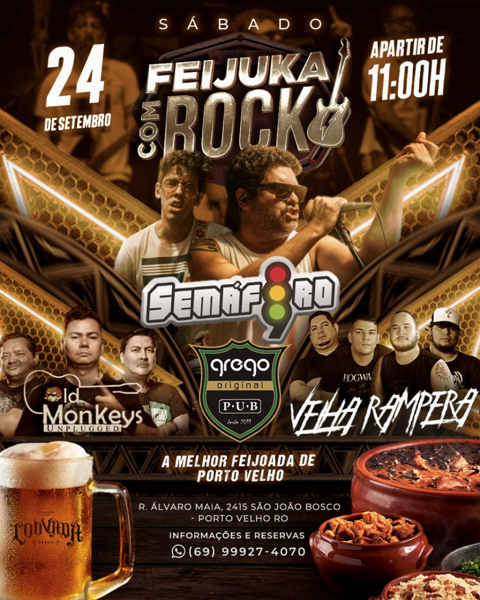 Conhecida nacionalmente pelas suas características únicas, o evento gastronômico e musical "Feijoada com Rock" vai receber, a partir das 12h, os shows simultaneamente das bandas Old Monkeys, palco principal, e Velha Rampeira, no palco lounge, na sequência, show da Semáforo 89.