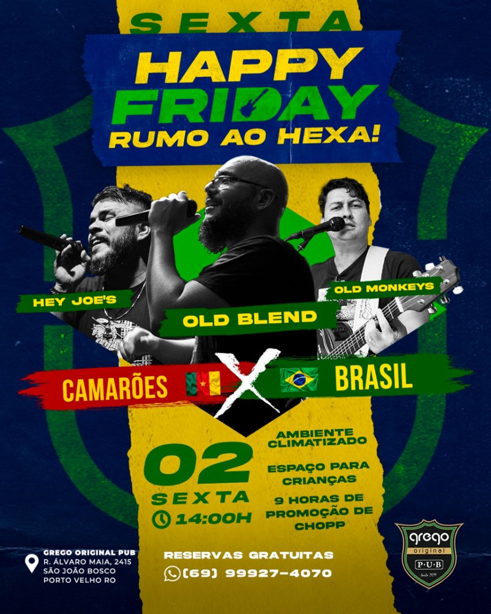 Venha torcer pela nossa seleção no premiado Pub porto-velhense, o Grego Original, onde vai rolar promoções de chopp e petiscos, das 14h às 22h. E o espeço kids gratuito com monitora infantil.
