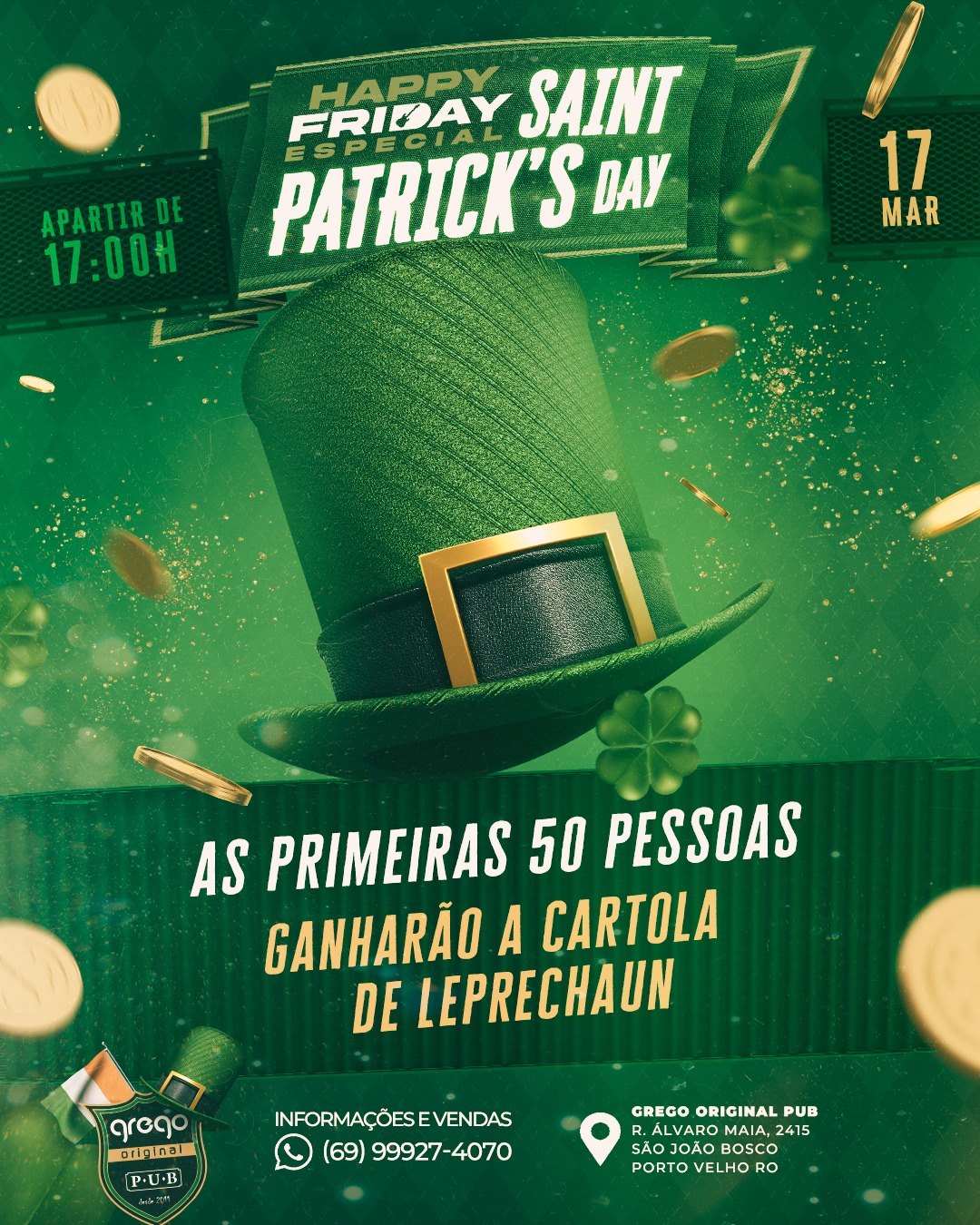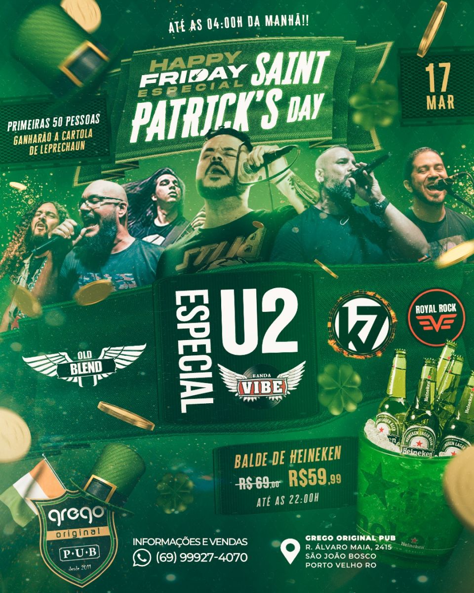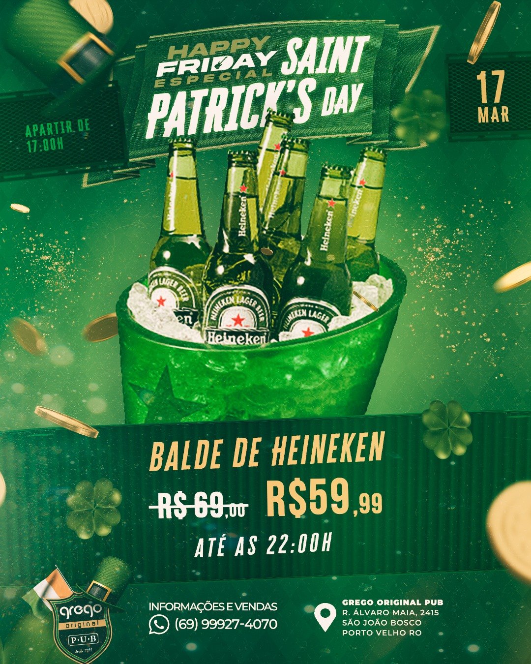 Sexta feira, iniciam-se os trabalhos com o evento Happy Friday especial de Saint Patricks Day, o dia do santo cervejeiro, incluindo várias promoções de chopps, petiscos e balde de Heineken!