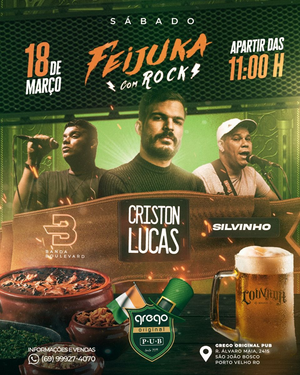 No sábado, casa aberta as 11h com o evento musical Feijuka com Rock, que contará com apresentação simultânea das bandas Boulevard, no palco principal e Silvinho Santos no espaço lounge. Logo após, vai rolar uma super tarde de sábado dançante, com show especial de Criston Lucas, vocalista da banda Versalle, que participou do programa The Voice Brasil de 2021, trazendo os clássicos do rock, pop e MPB para sua tarde.
