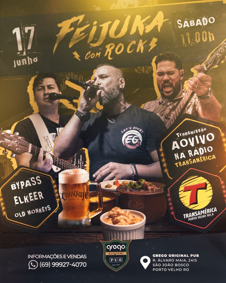 Para quem quer curtir boa comida e boa música, sábado a partir das 11 horas da manhã, casa aberta para feijuka com rock. De bandas contaremos com apresentações de Bypass e Elkeer Guillen Rock Show. No espaço lounge banda Old Monkeys.