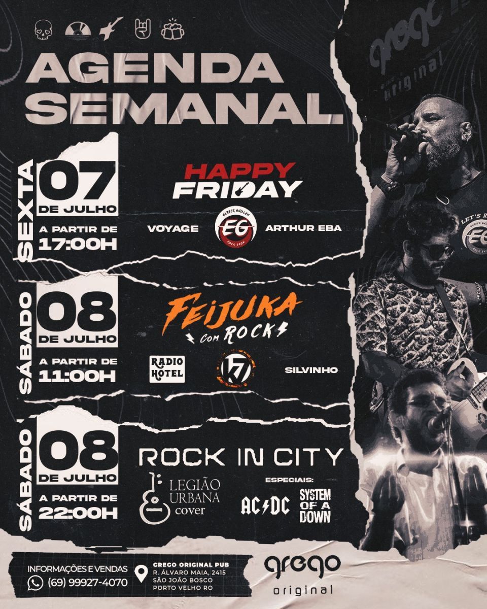 Para iniciar o fim de semana com o pé direito, o happy hour mais rock and Roll da cidade inicia as 17h, com promoções de chopp, gin tropical e calabresa com fritas até às 22h. Dando início as atrações musicais, banda Voyage com os melhores sucessos do New metal anos 2000. Seguidos de Elkeer Guillen e seus clássicos de agradar a todos os gostos.