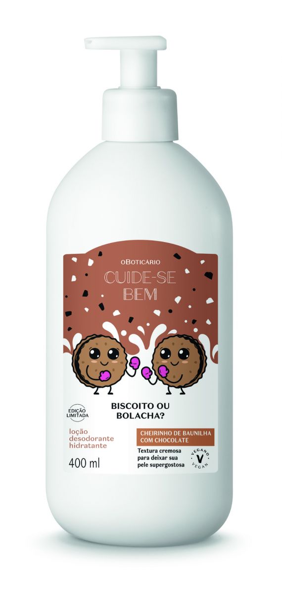 A Loção Hidratante, que já é um produto queridinho dos lovers de Cuide-se Bem, é um dos destaques da linha Cuide-se Bem Biscoito ou Bolacha? por manter a pele hidratada por 48 horas, deixando-a macia e perfumada, sem a sensação de pele grudenta, e está disponível em duas volumetrias, de 400 ml e 200 ml. Outra supernovidade é o Sabonete Líquido Corporal, com a cor e textura de calda de chocolate, que entrega um banho delicioso, remove as impurezas e o excesso de oleosidade sem ressecar a pele; enquanto o Body Splash deixa a pele com cheirinho de baunilha e chocolate por um tempo prolongado.