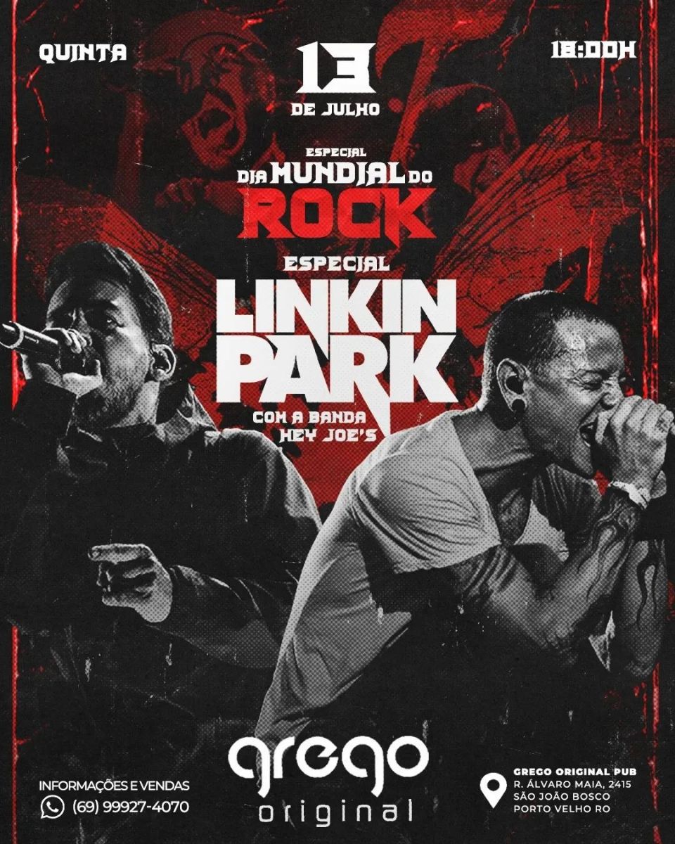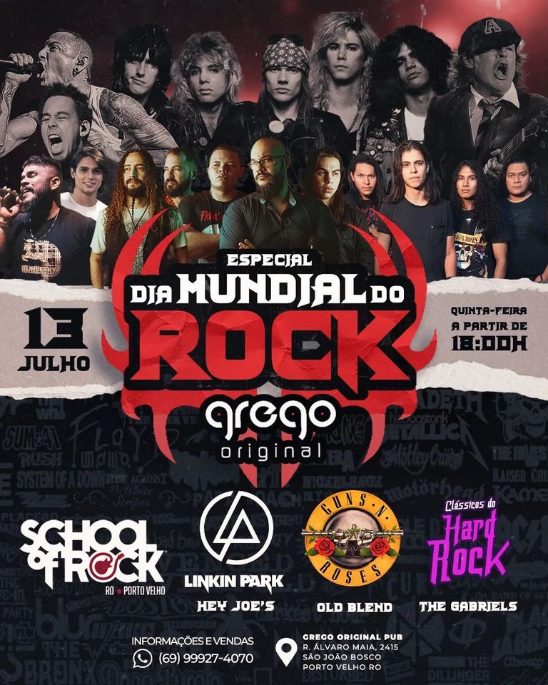 Para os amantes do estilo de vida rock and roll, dia 13 de julho é uma data de muita comemoração, pois marca o dia mundial desse gênero musical tão querido. Assim sendo, excepcionalmente o grego irá abrir na quarta-feira, dia 13, a partir das 18 horas com uma programação incrível. Abrindo a noite, banda The Gabriel's com o repertório voltado aos maiores clássicos do Hard Rock. Seguidos de banda Hey Joe's que apresentará tributo a banda Linkin Park, agraciando aqueles apaixonados pelo rock alternativo dos anos 2000.