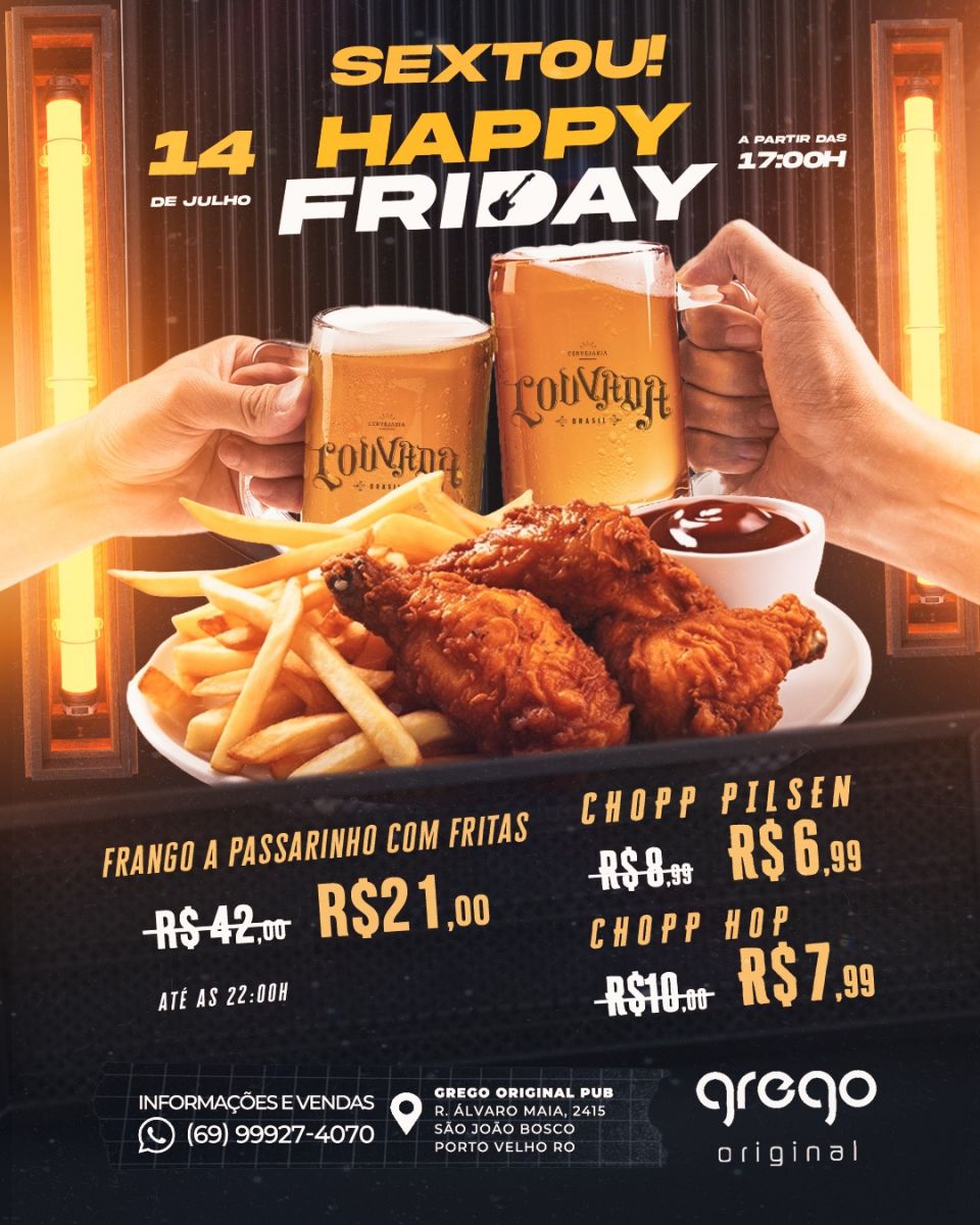 A casa abre as 17h. Chegando até 19h sua entrada é na faixa e as promoções de chopp, drink e petisco vão até às 22h.