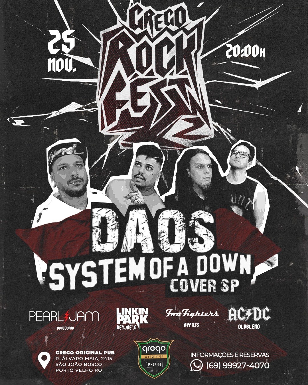 Grego Original preparou uma super programação: 5 bandas e 5 especiais de todos os estilos de rock, do New metal ao clássico. O line UP contará com DJ Mario Henrique, Banda Old Blend com especial Ac Dc, banda Hey Joe's com especial Linkin Park e banda DAOS, cover System of a down vindo diretamente de Sp. Tudo isso no palco principal. Já no palco lounge, banda Boulevard com especial Pearl Jam e banda Bypass com especial Foo Fighters.
