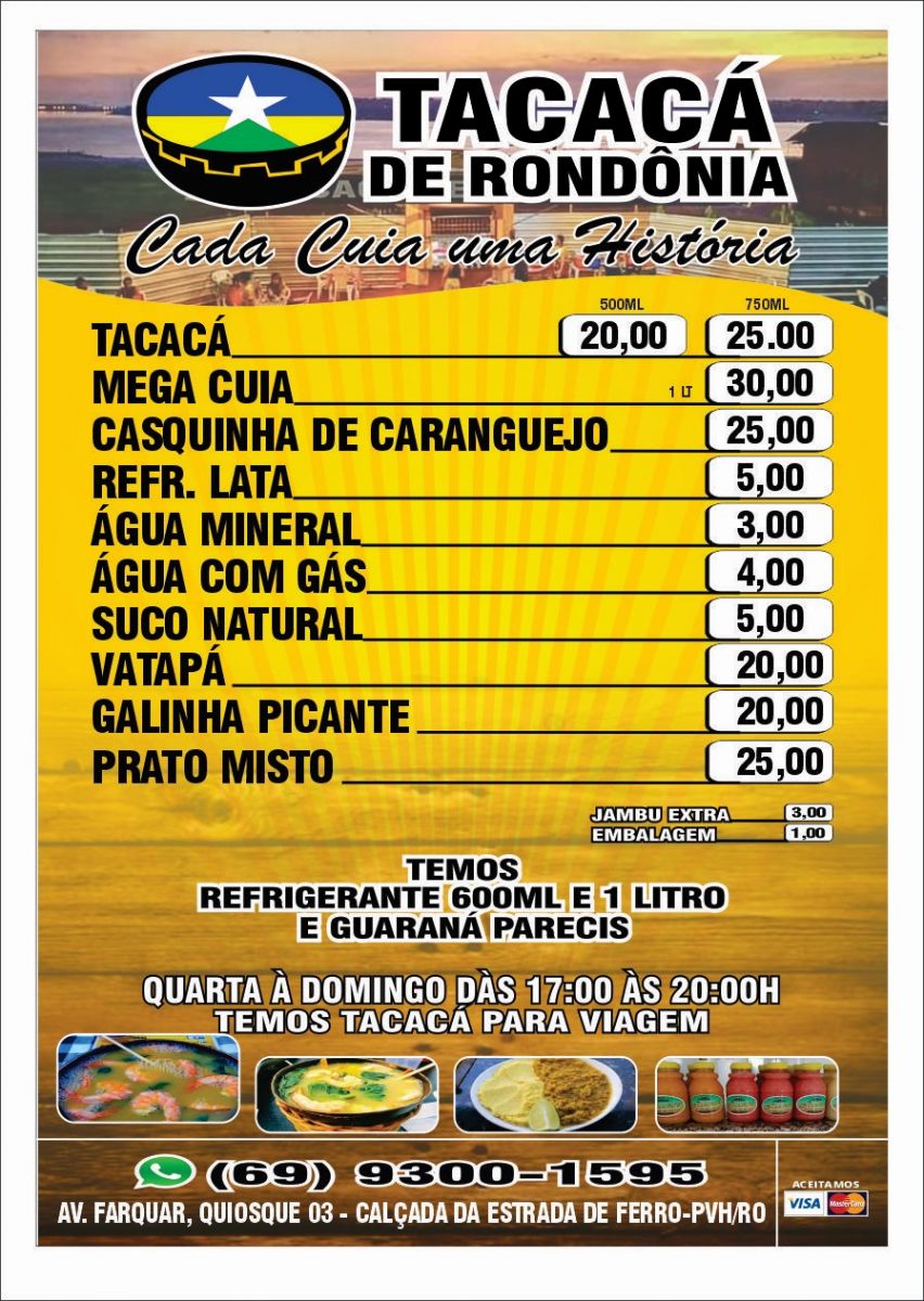 Traga a família, os amigos e venha se deliciar com o melhor Tacacá de Rondônia. Funciona de quarta à domingo, das 17h às 20h, no calçadão em frente a Estrada de Ferro Madeira Mamoré, na avenida Farquhar, 952 – no Centro de Porto Velho/RO.