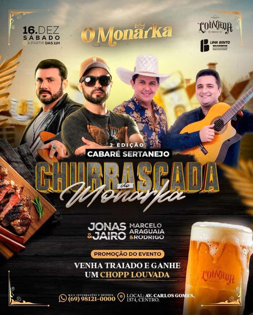 Neste sábado, dia 16, a 'Churrascada do Monarka' vai rolar o 2° especial 'Cabaré Sertanejo', com show de Marcelo Araguaia e Rodrigo, na sequência, show de Jonas e Jairo.