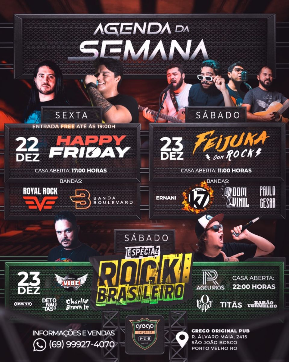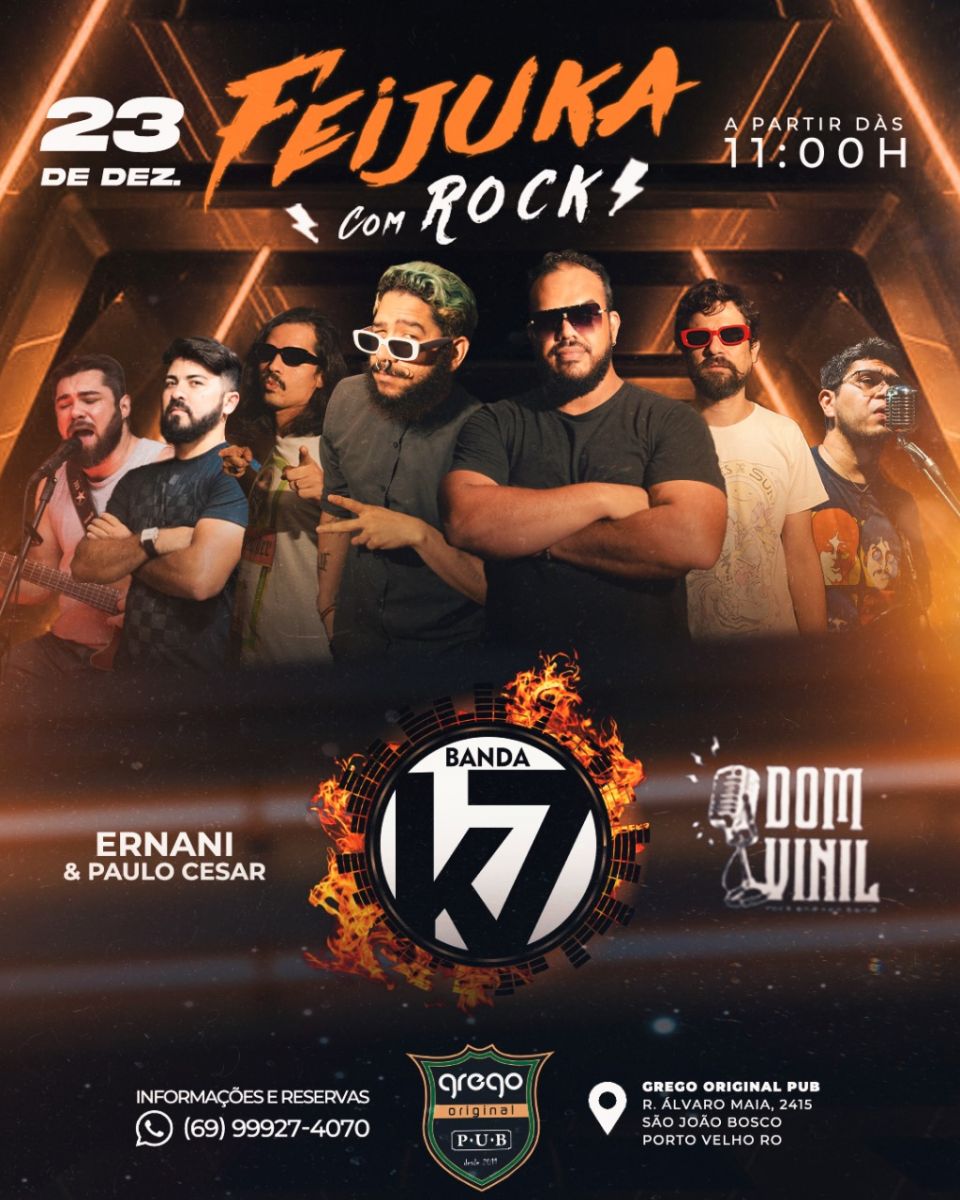 Para quem gosta de boa música e comida saborosa, a feijuka com rock é o melhor lugar! De atrações musicais a casa contará com a presença de banda Dom Vinil, banda K7 e Ernani Neto.