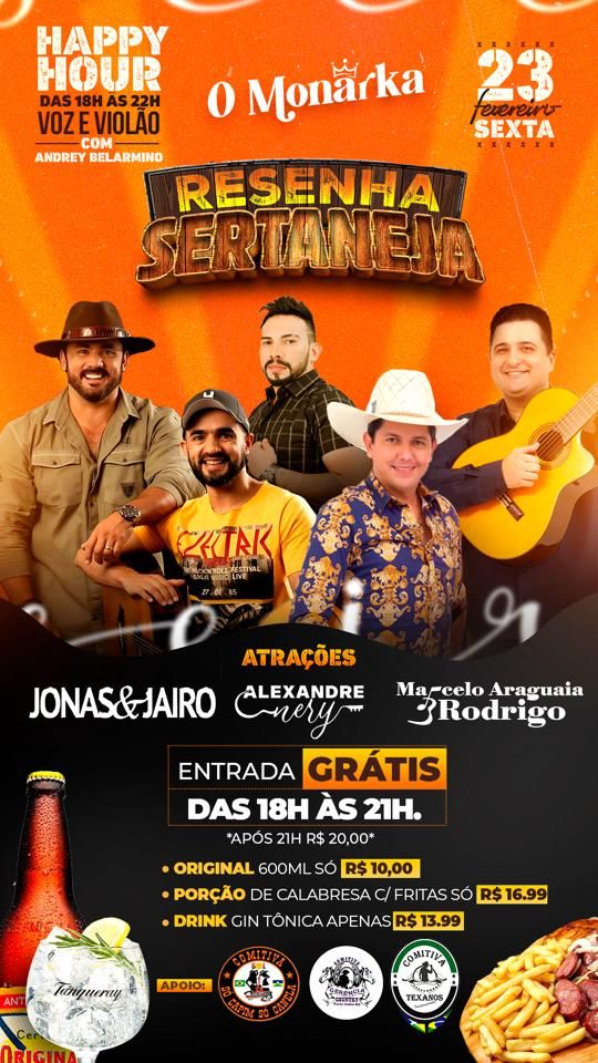 "Lembrando aos amantes de um bom modão de viola, que nesta sexta-feira, dia 23, antes da nossa 'Resenha Sertaneja', das 18h às 22h, vai rolar aquele happy hour, com apresentação na vitrine do nosso O Monarka, na voz e violão dos músicos Lucas e Bárbara, na sequência, showzaço das duplas Jonas & Jaíro e Marcelo Araguaia e Rodrigos no palco principal", enfatizou o empresário Sinezio Tapajós, proprietário da nova casa de shows considerada o novo conceito de entretenimento, lazer e gastronomia de alta qualidade.