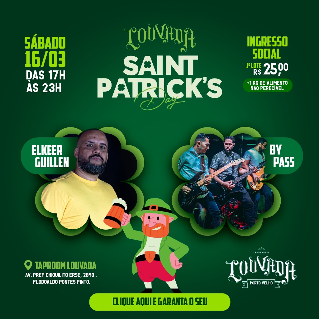 Foi iniciada na sexta-feira (01) a venda de ingressos para a St. Patrick 's Day Louvada 2024. O evento ocorre no próximo dia 16 de março, das 17h às 23h, no taproom da cervejaria, localizado na Avenida Prefeito Chiquilito Erse, nº 2890, no bairro Flodoaldo Pontes Pinto. Os participantes apreciarão uma noite com muito rock'n’nroll e, é claro, com o inconfundível chopp Louvada.