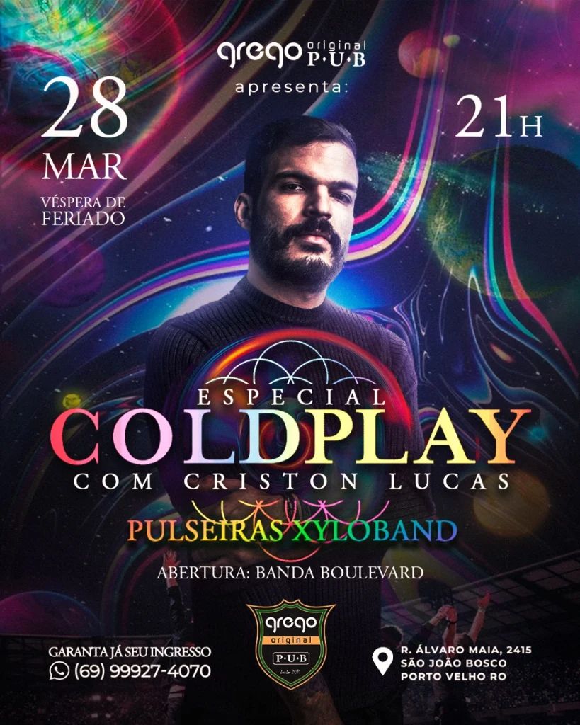 Aos Fãs de Coldplay, uma experiência única se aproxima nessa Quinta feira (28/03). Criston Lucas interpretando os maiores sucessos dessa banda tão amada. De pre show, banda Distopia. No espaço lounge, banda boulevard.