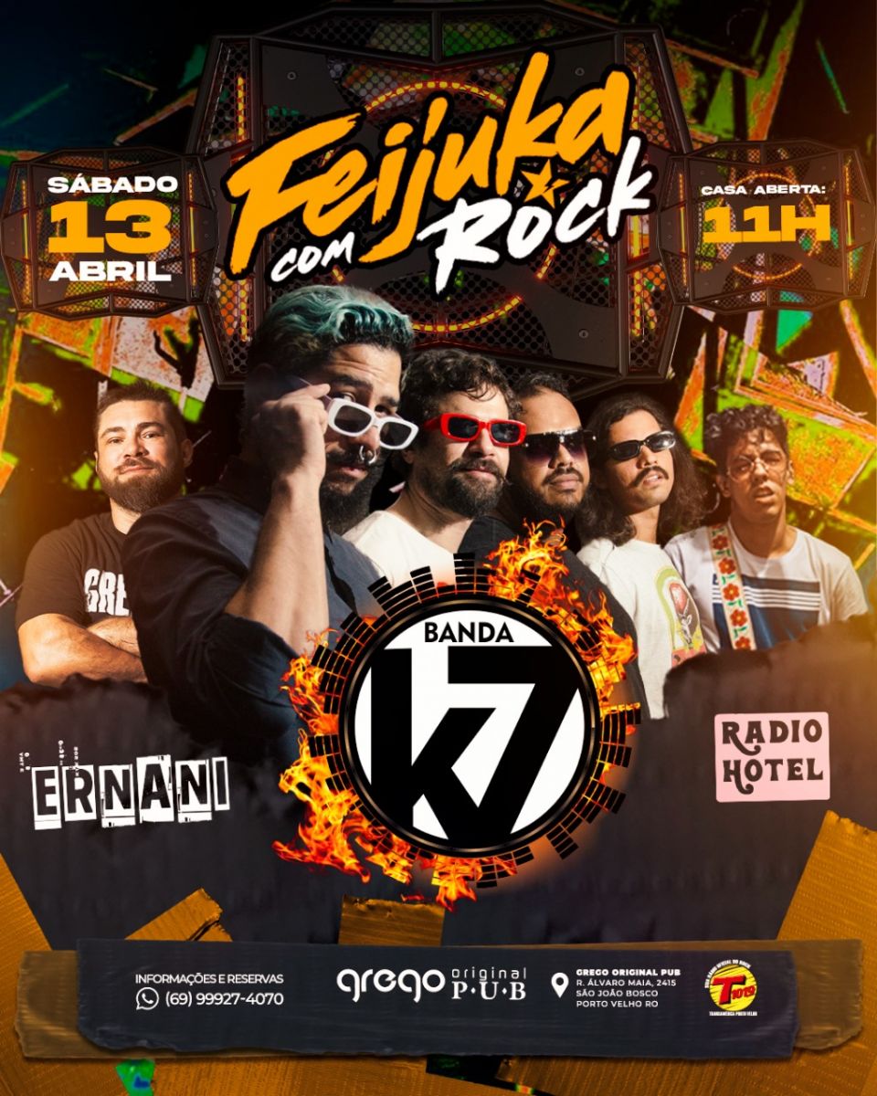 Os sábados são mais divertidos por aqui! Se você gosta curtir uma tarde agitada, com boa música e uma gastronomia diferenciada, precisa conhecer a feijuka com rock do grego original. Nesse sábado, o comando do show fica por conta das bandas K7, Rádio Hotel e Ernani Neto.