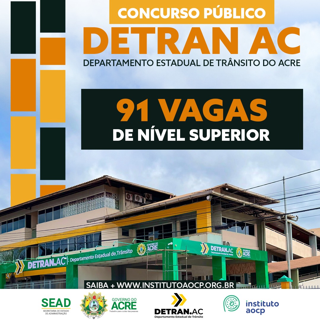 Acre (Detran AC) serão encerradas às 23h59 (horário de Brasília/DF) do dia 23 de maio de 2024. O certame, realizado pela Secretaria de Estado de Administração (SEAD) do Acre em parceria com o Instituto AOCP, conta com remunerações que podem passar dos R$ 9.500, quando somadas às gratificações, e dispõe de 91 vagas para profissionais de níveis Superior em diversas áreas.