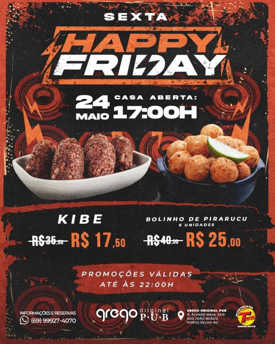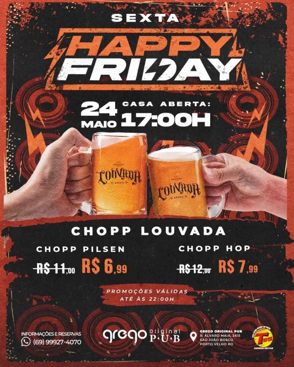 Sexta feira, aberta a partir de 17h com muito happy hour! Chopp a partir de $6,99 e petiscos com 50% off. De atrações musicais, banda RockUp e banda Royal Rock.