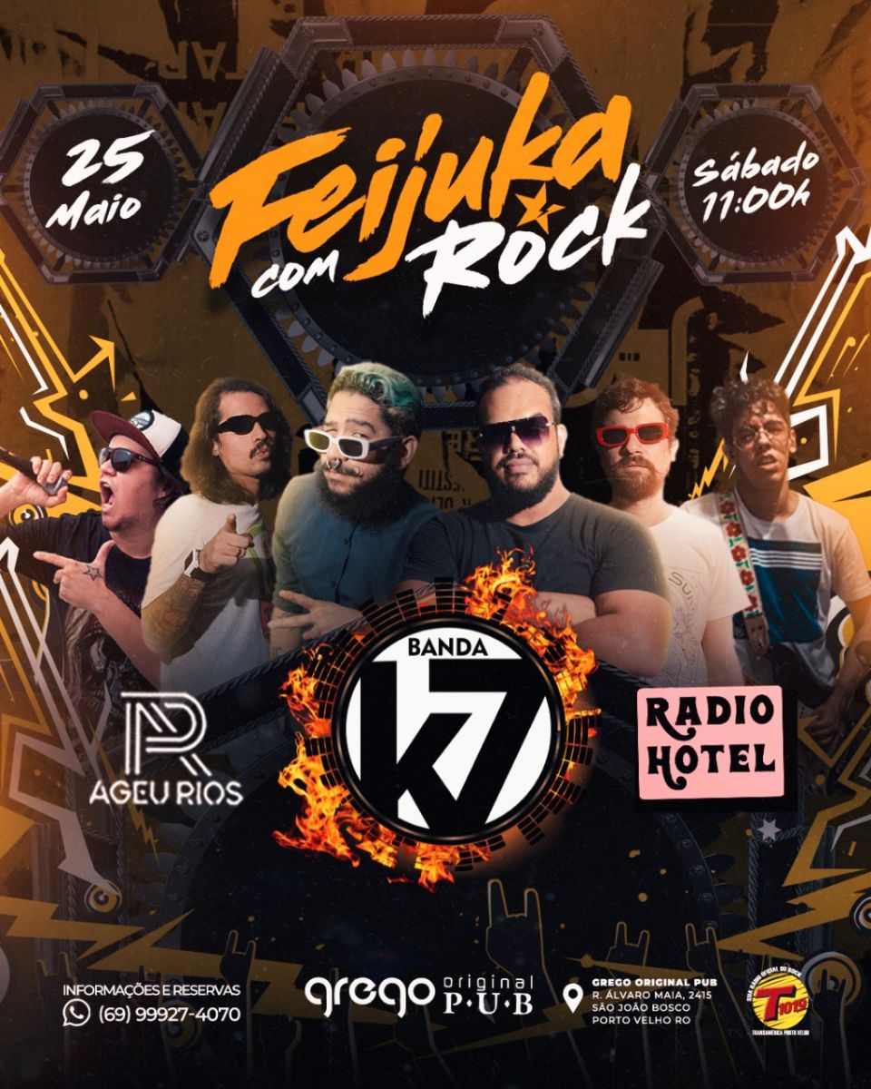 Os sábados são mais divertidos por aqui! Se você gosta curtir uma tarde agitada, com boa música e uma gastronomia diferenciada, precisa conhecer a feijuka com rock do grego original. Nesse sábado, o comando do show fica por conta das bandas Rádio Hotel e banda K7. No espaço lounge, com a presença de Ageu Rios.