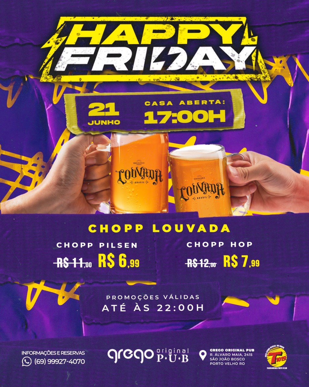 Toda sexta feira, happy hour no Grego Original. Chopp a partir de $6,99 das 17h as 22h. Petiscos 50% Off. Conduzindo o palco, shows de banda RockUp e banda Hey joe's.