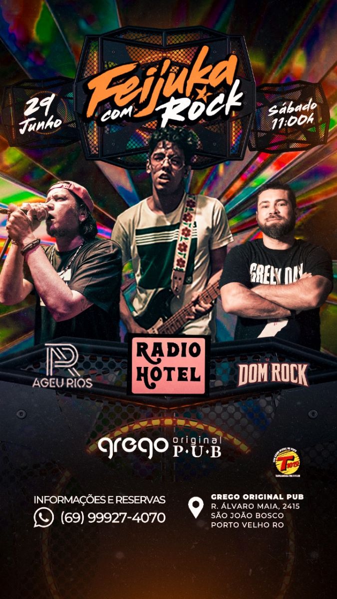 Se você curte uma balada no sábado a tarde, precisa conhecer a feijuka com rock do Grego Original: são 3 bandas garantindo a festa das 11h as 18h.