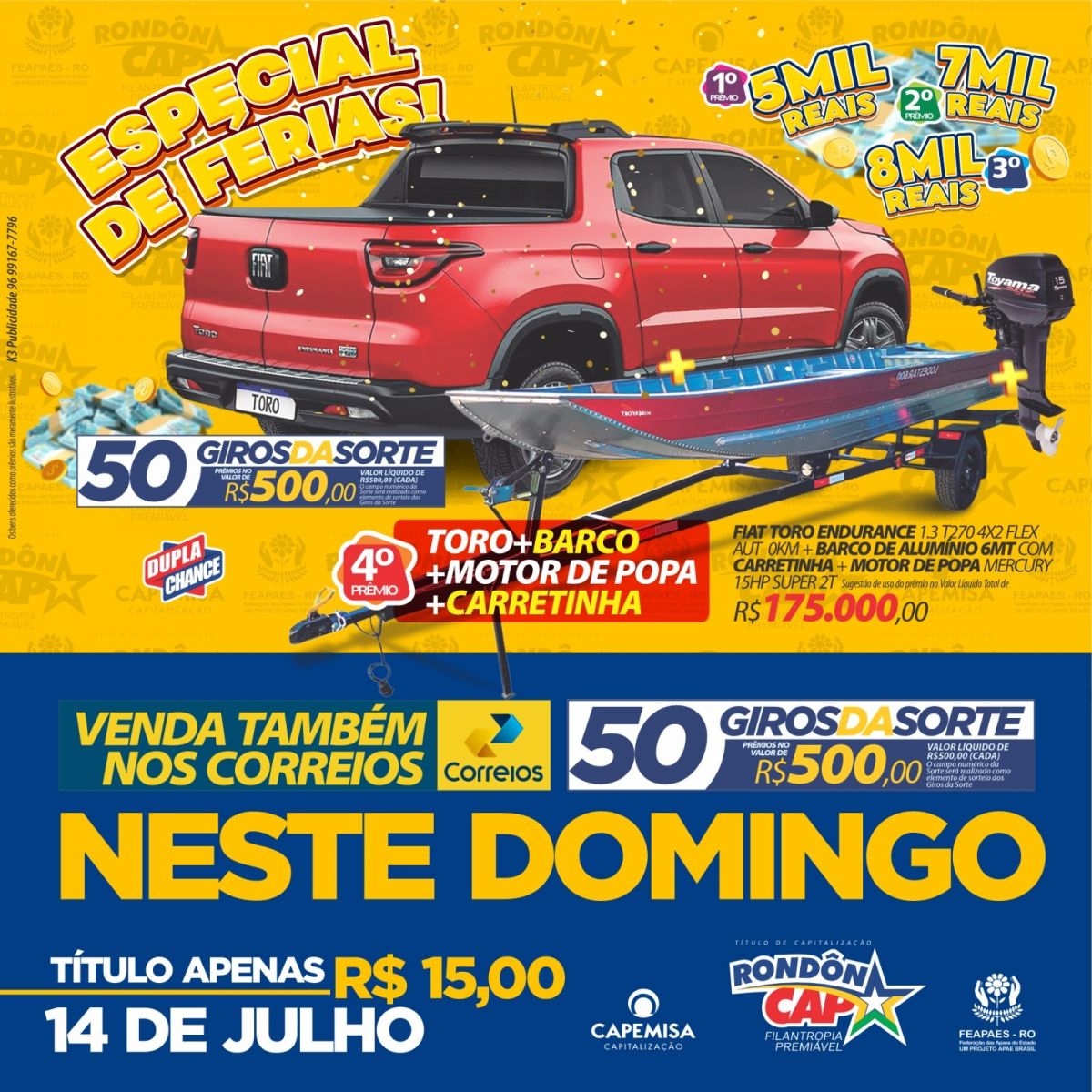 Especial de Férias é pra você! Domingo tem uma Fiat Toro mais um barco de alumínio, uma carretinha e um motor de 15HP; tudo junto ou valor de 175 mil só no Quarto Prêmio.