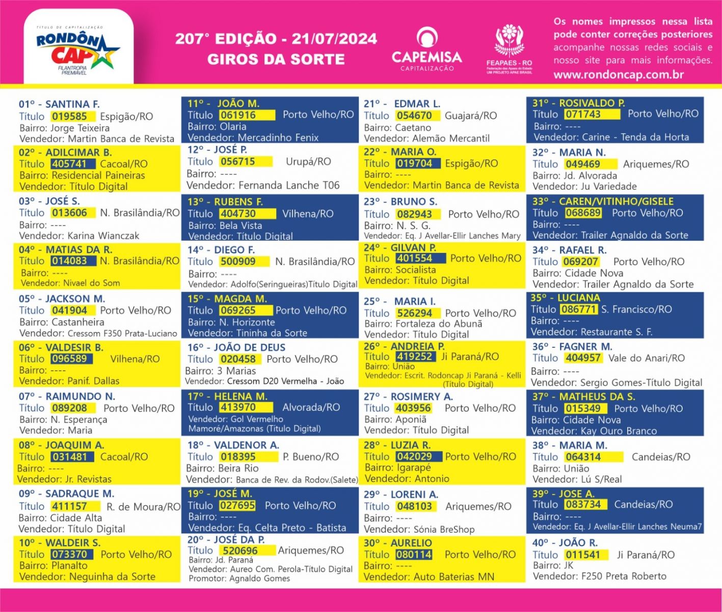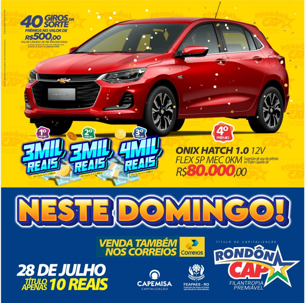 O RondônCAP quer ver você fechar o mês de julho com carro zero na garagem e muito dinheiro no bolso! No quarto prêmio deste domingo tem um Onix zero quilômetro no valor de 80.000 reais! Já pensou ganhar um Onix novinho investindo apenas 10 reais? Com o RondônCAP deste domingo você pode! E ainda tem mais 4 mil, 3 mil, 3 mil e 40 giros de 500 reais! Compre o seu RondonCAP Fisico ou Digital por apenas 10 reais - ajude as Apaes e Participe!