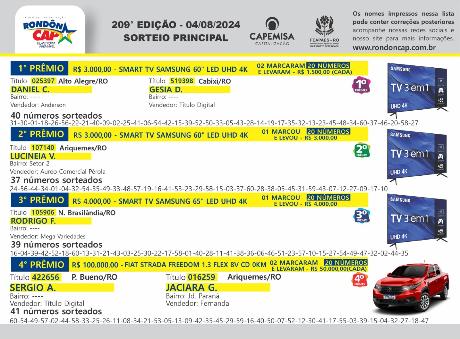 Ganha quem faz Mais Pontos e ganha quem faz Menos Pontos - são dois prêmios para cada sorteio! No 4º prêmio tem a nova S10 de 250 mil para quem marcar tudo e um Fiat Mobi de 60 mil pra quem marcar menos pontos; são dois carros! E mais: São duas motos Honda no Primeiro Premio, uma para mais e outra para menos pontos, mais duas no segundo; para mais e menos pontos e mais duas no terceiro prêmio também para mais e menos pontos, além é claro dos 40 giros de 500 reais.