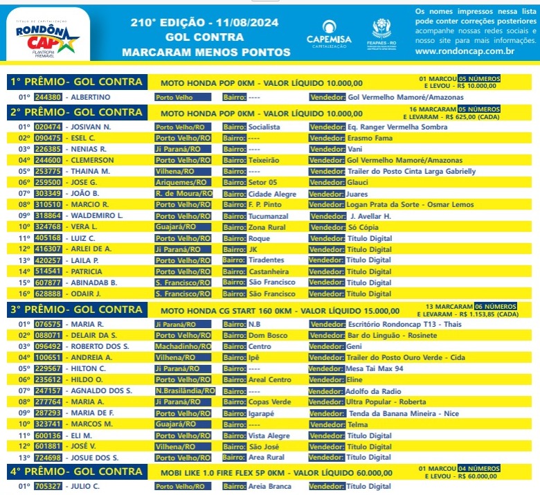 Quando você ajuda as Apaes a sorte pode ajudar você! Só em 2024 já foram mais de 1.500 ganhadores no RondônCAP, e no próximo domingo tem 65 mil no 4º prêmio; e ainda tem mais três prêmios de 5 mil e 40 Giros da Sorte de 500 reais. Serão 100 mil em prêmios; e o Titulo só 10 reais. É dinheiro direto na sua conta para você fazer o que quiser!