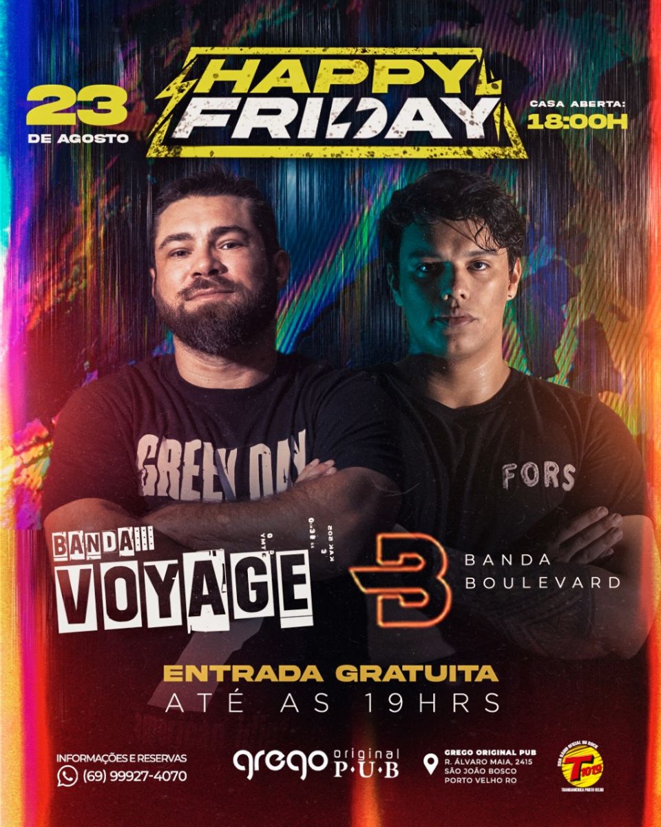 Chopp por apenas $7,99 só aqui! Happy Friday do grego original! Casa aberta a partir das 18h, com promoções até às 22h! Duas bandas fazem a festa até 02h da manhã! Nesta semana, banda Voyage e Banda Boulevard garantem que seu sextou seja um luxo!