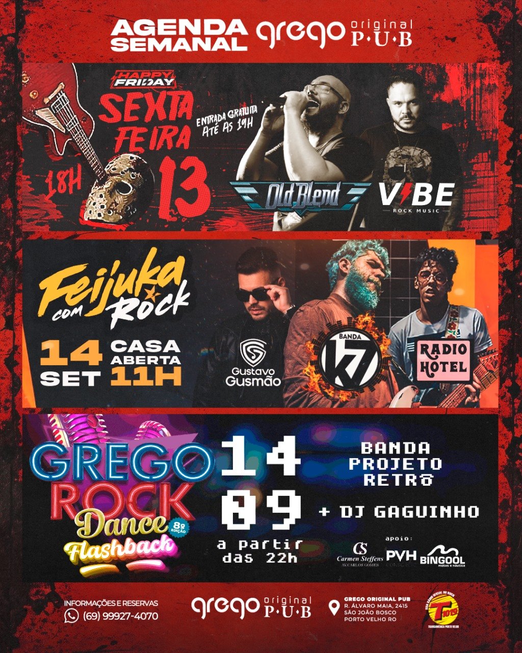 Chopp por apenas $7,99 só aqui! Happy Friday do grego original! Casa aberta a partir das 18h, com promoções até às 22h! Duas bandas fazem a festa até 02h da manhã! Nesta semana, banda vibe e banda Old blend garantem as boas energias do rock and roll em plena sexta feira 13!